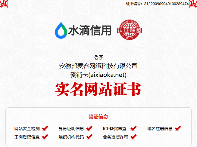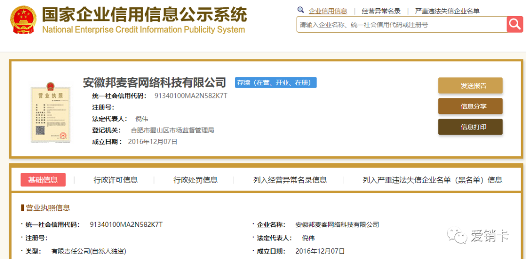 爱销卡是安徽邦麦客网络科技有限公司旗下产品,公司注册于2016年,目前已经正常运营近5年,公司始终专注于互联网行业,竭诚为更多用户提供优质的服务。